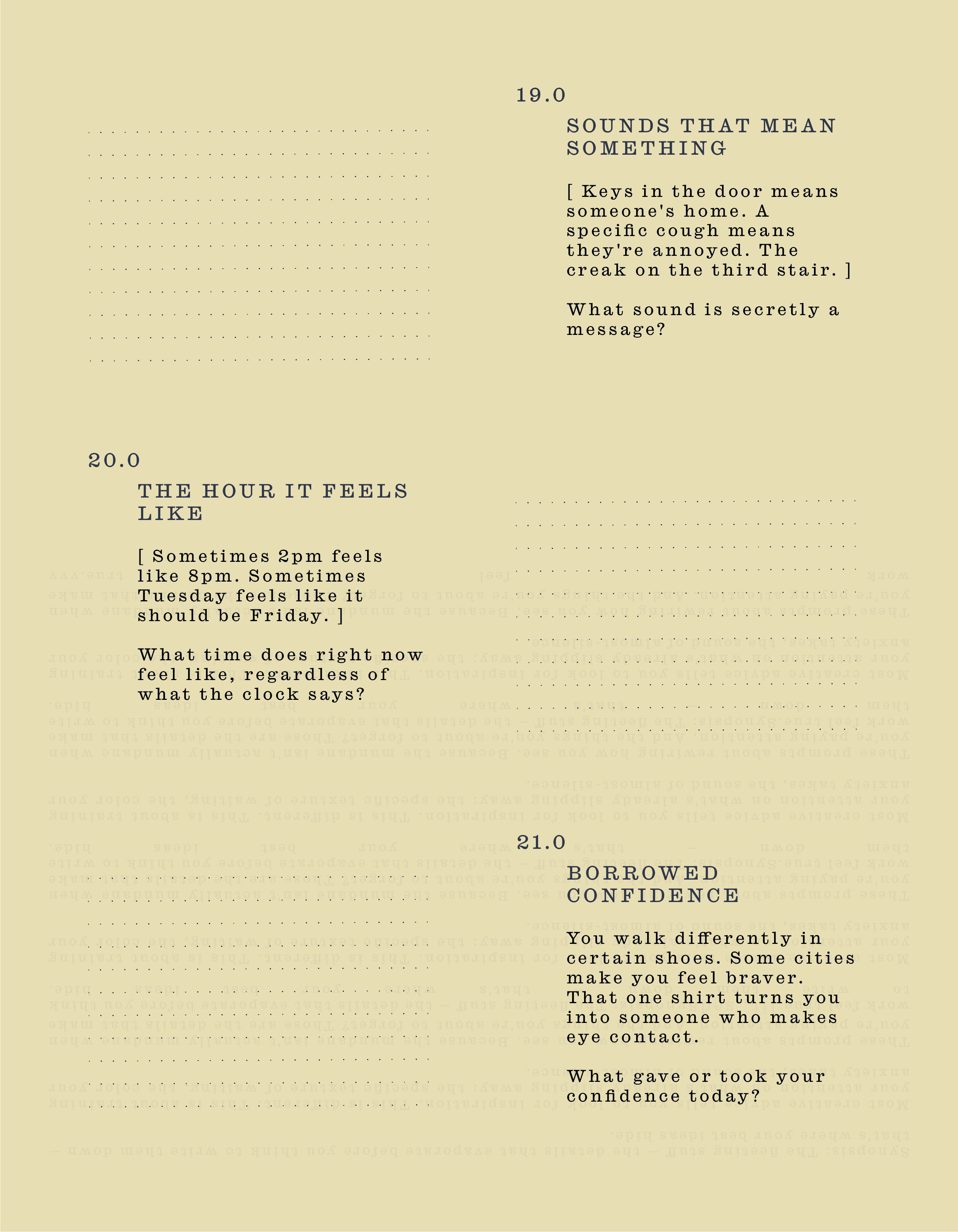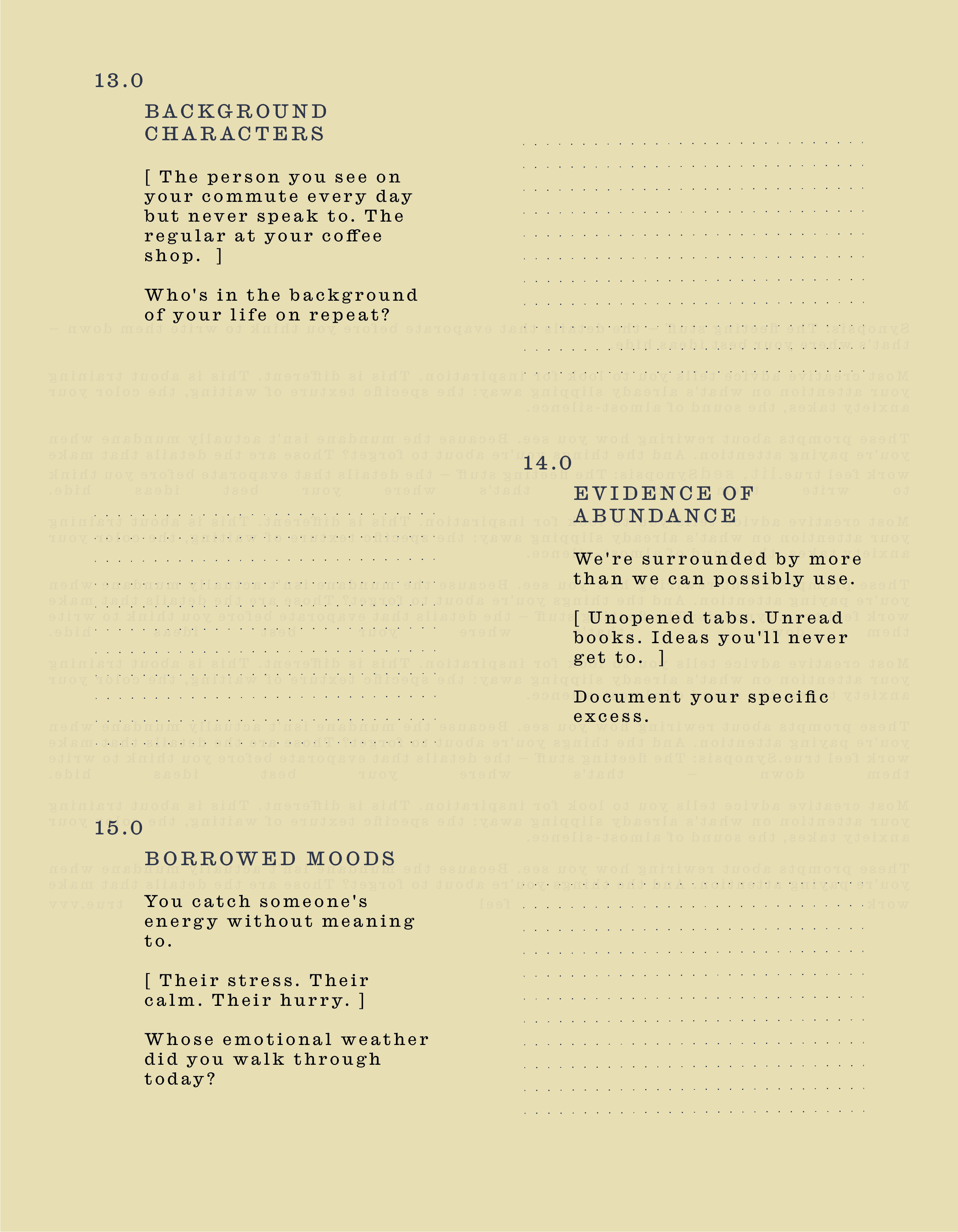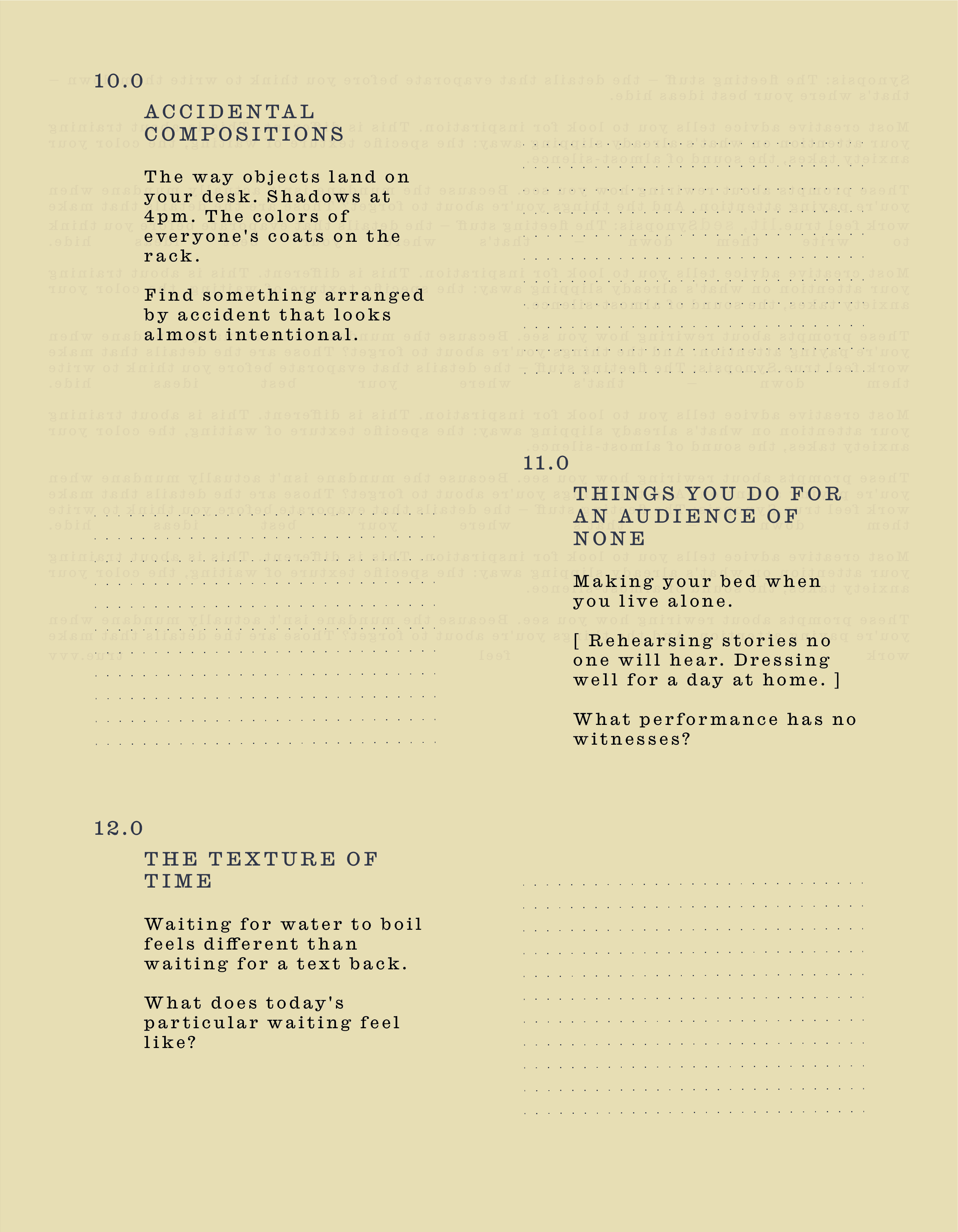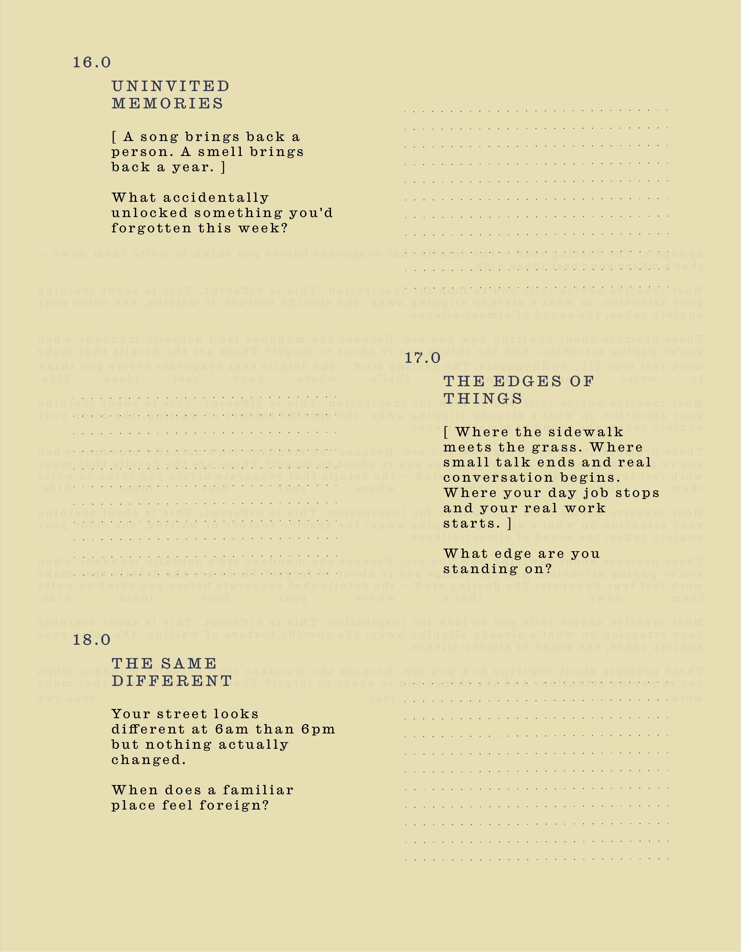 These prompts about rewiring how you see. Because the mundane isn't actually mundane when you're paying attention. And the things you're about to forget? Those are the details that make work feel true.