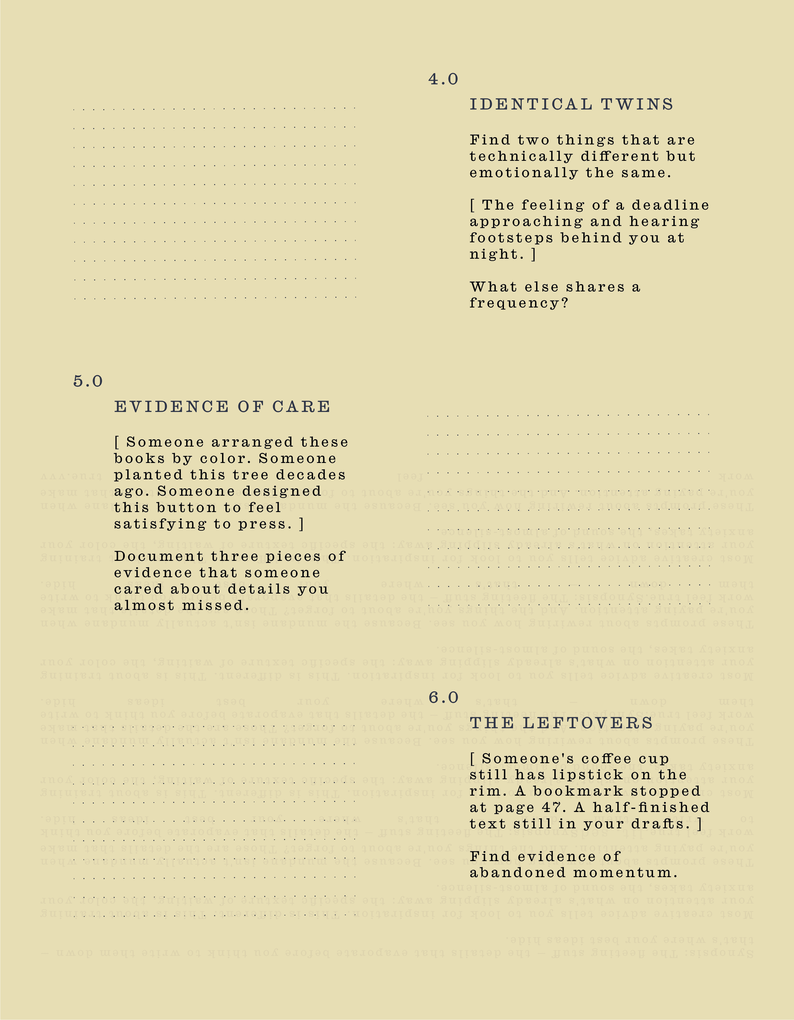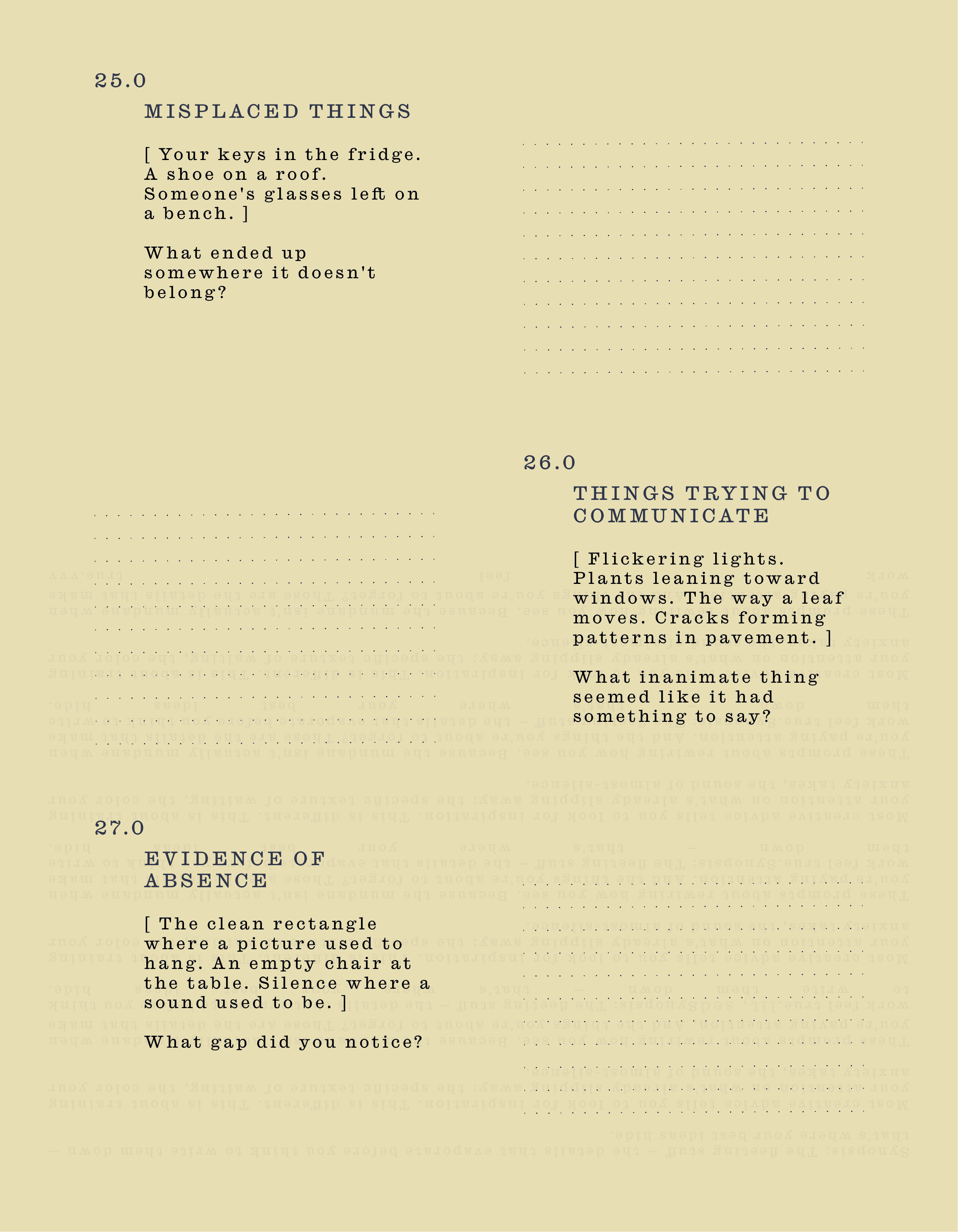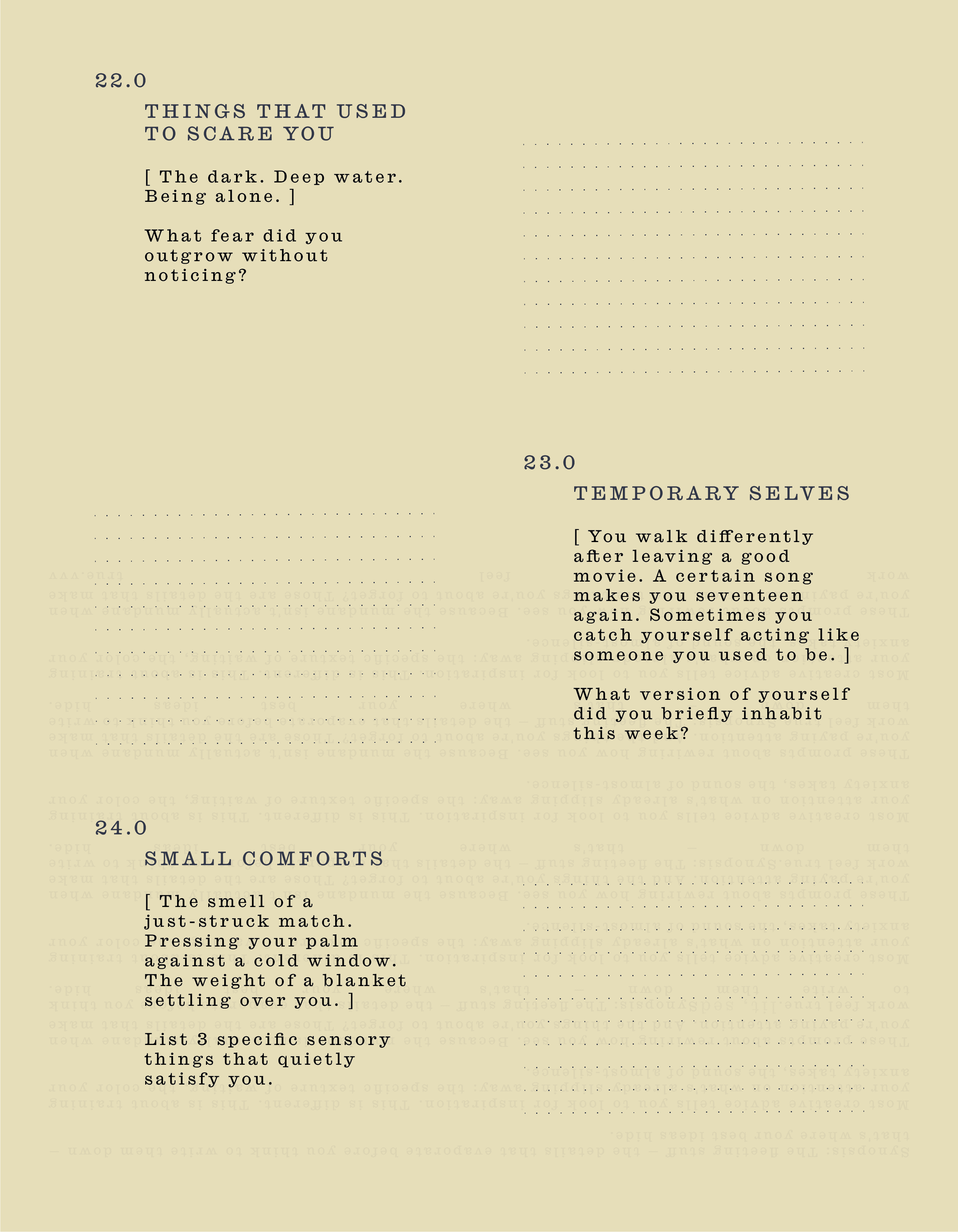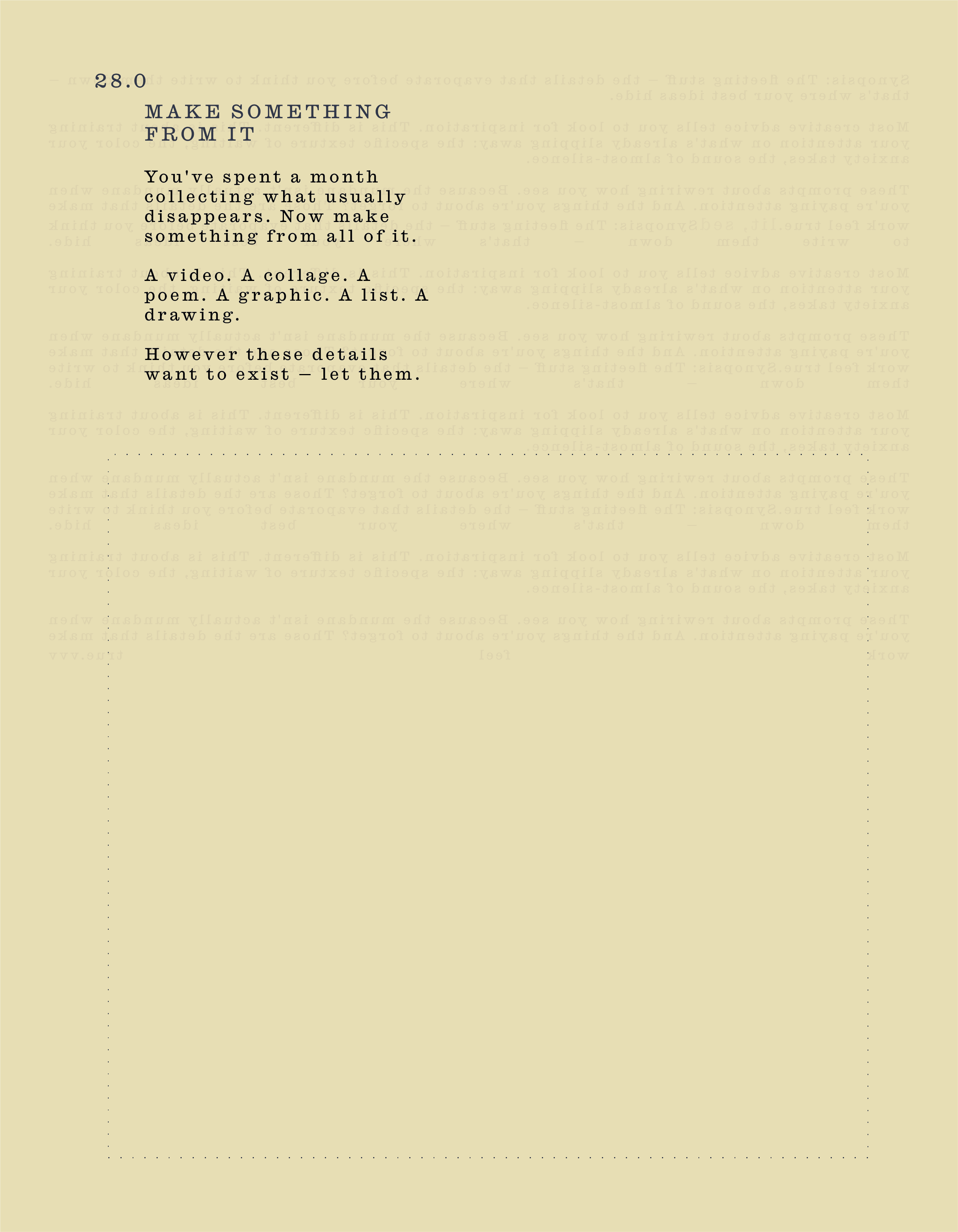 These prompts about rewiring how you see. Because the mundane isn't actually mundane when you're paying attention. And the things you're about to forget? Those are the details that make work feel true.